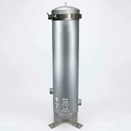 Stainless steel housings encase filter cartridges that purify liquids by removing solids and contaminants as the fluid passes through. The robust design ensures longevity and efficiency under demanding conditions.